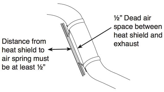 Heat shields included in Air Lift air suspension kits are typically flat and contain two tabs which must be bent in order to provide at least a ½” of dead air space between the heat source and the shield. The heat shield can then be attached via the tabs and clamps included in the kit. An additional ½” of clearance must remain between the air spring and the heat shield.