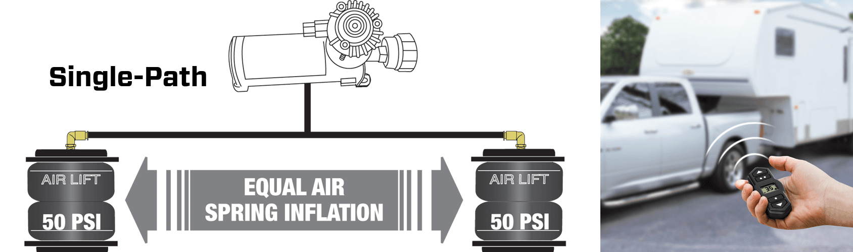 Single-path systems allow you to inflate or deflate two (or more) air springs at the same rate, at the same time, to the same air pressure. Your air springs will always be set to the same pressure.